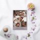 Elegant and practical informal wedding invitation with a photo collage of five photos on the front and a sixth photo on the back. Spanish grey photo collage wedding invitation with your names in rose gold foil. Practical wedding invitation with the information easily available on the front with room to add a link to your wedding website on the back. Minimalist photo collage wedding invitation personalised with your names in gold foil. Warm grey and rose gold wedding invitation with a photo collage and minimalist wedding wording.