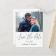 This is a simple vertical Save the Date post card that lets your photograph take centre stage! At the bottom of your photo is stylised text in grey that says SAVE the DATE. Below that are two custom text fields, also in grey. Small details with big impact! The back of the card has plenty of room for your custom text. Looks great with either B&W or colour photographs.