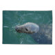 A grey seal swims gracefully through the calm sea water, its head clearly breaking the surface. Ripples spread outward, creating gentle patterns around it. Close in photo taken at Chatham Fish Market, famous for fresh seafood and photos of seals at the docks. Chatham, MA