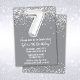 Grey and silver 7th birthday party invitation age 7 birthday party invitation with glitter and modern script writing and fun foil balloons.