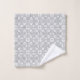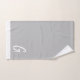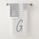 Handsome bath towel set done in grey and white featuring stripes, on the bath towel and a big grey one letter monogram. The wash cloth is done in a grey and white damask pattern and the hand towel is grey with a white band, on one side and a white single letter monogram. Personalise the letter to suit your needs.