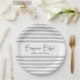 Designed to match the colour of our nursery collection. The design features simple yet modern light grey and white stripes (great for gender-neutral), a header that reads "Bonjour Bebe", meaning hello baby, and one line of text for personalisation.