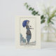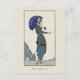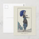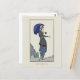 A postcard with the vintage French fashion illustration, Robe à Retroussis by Gerda Wegener (1886-1940) a Danish artist. A fashionable woman dressed in a grey suit with a striped skirt holding a parasol with a butterfly on her hand. A digitally altered and enhanced image from the Journal des Dames.
