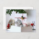 Light grey, or grey, tabby kitty cat has settled into a box and has no intention of leaving in cute cat lovers Christmas holiday postcard