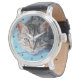 The feature on this fine art wrist watch is an original oil painting "Cattitude" by award winning artist Debra Mickelson. The image is a portrait of a beautiful grey tabby cat with yellow green eyes. Around the perimeter of the watch face are tiny black cat paws which segment five minute intervals of time. The cat paw images are customisable, so if you'd prefer to delete them, you may do so by clearing out the field.