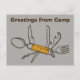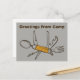 Keep in touch with friends and relatives with this cute greetings from camp postcard. This postcard features a grey background and an illustration of a multifunction pocket knife tool. The brown text on the front can be customised or personalised using the fill-in-the-blank text field. Makes a fun gift for kids headed to summer sleepaway camp.