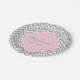 Grey and white chevron pattern with pastel pink accent baby shower paper plates. Grey and white zigzag and in the middle  there is a pastel pink rectangle with your custom text.
