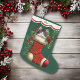 This Holiday stocking has an image of an adorable grey and white cat peeking out of an ornate red stocking. The image is surrounded by holly, red berries, and poinsettia blooms, and is placed on a Christmas green background. A white scalloped edge design bordered in red holds your customised name at the top. The back of the stocking is identical to the front.