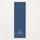 Personalised grey and white monogrammed yoga mat with a script font on a navy blue background. Simple elegance.
