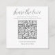 Grey and white share the love QR Code cards. Place these small cards at your wedding reception tables so guests can scan to upload the photos they took at your wedding reception to your album or social media. To generate a new QR code on the design, add the URL of your online wedding album or social media handle in the area provided, using the "personalise" feature. A brand new QR code will then be added to to the design.