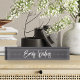 Elegant desk nameplate features your name, title, or choice of personalisation in white hand scripted cursive lettering on a dark grey background.