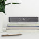 Elegant desk nameplate features your name, title, or choice of personalisation in modern white hand scripted cursive lettering on a neutral grey background.