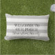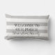 Modern grey white stripes welcome to our porch script, family name Lumbar Pillow