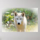 This captivating photograph showcases the regal presence of a grey wolf amidst a vibrant green field and lush vegetation. The majestic wolf stands tall and self-assured, its sharp gaze conveying intelligence and strength. Its thick, textured fur seamlessly blends with the natural backdrop, creating a harmonious scene.
