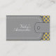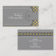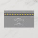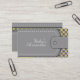 Grey and yellow leather look and pattern accessories business card template showcasing two grey bands with seams and a button in leather style-not real leather just a PRINTED image and geometric pattern in grey and yellow.