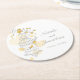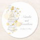 Cute bird couple in graphic drawing of open bird cage hanging from a blossoming spring tree with hearts. Fashionable modern chic wedding design part of the the bird cage romantic wedding stationary set. Pretty pastel shades of grey, warm gold yellow and white. Edit these coasters with your own name and dates. Unique drawing and design by Sarah Trett.
