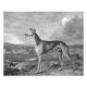 A black and white illustration or a greyhound dog standing proudly in a field. This vintage illustration is beautifully drawn in black and white, with a great amount o texture and detail in the dog, the grass, and the clouds in the background.