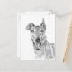 Smiling, cheery greyhound drawn in charcoal by Kate Sumners. This greyhound has on ear up and one ear down as well as a winning smile. Sketched in detail, head and shoulders.