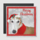 Greyhound Christmas -A red fawn and white greyhound dressed up in a red Santa hat and red collar set on a silver grey bokeh snow background. Framed with a red square frame. Merry Christmas in red script font can be personalised with your message.