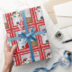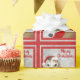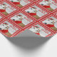 Greyhound Christmas -A red fawn and white greyhound dressed up in a red Santa hat and red collar set on a silver grey bokeh snow background. Framed with a red square frame. Merry Christmas in red script font can be personalised with your message.