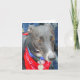 Beautiful black greyhound photo card, blank inside for your personalized message. This photograph of a black greyhound wearing a red jacket was taken on one of the Retired Greyhound Trust organized walks, at Portreath in Cornwall by Jayne Herbert.