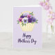 Designed with a stylized floral illustration, the card centers on a soft yellow basket with simple vertical lines hinting at a woven texture. The basket overflows with pansy-like blossoms in lavender, deep violet, blush pink, and white, each flower showing a dark center with a small yellow core that feels like a shared secret between close friends ❤️. Fresh green leaves peek through the bouquet, adding a just-picked look that brings a gentle, romantic warmth to the scene. The background is a muted lavender with a faint grid pattern that quietly frames the artwork without distracting from it. Beneath the flowers, a message sits in flowing deep purple lettering, placed low and centered to balance the basket above. Soft gradients and calm purples paired with cheerful yellows create an easy springtime mood, like a caring glance exchanged across the room 🌼. The text appears in deep purple near the bottom against the pale lavender background, with the basket and bouquet occupying the upper center.