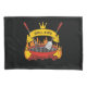 Barbecue grill over flaming charcoal, scroll banner with custom text over fork and spatula.