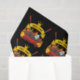 Barbecue grill over flaming charcoal, scroll banner with custom text over fork and spatula. Custom background colour.