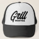 Grill Master trucker hat for BBQ party chef. Custom black and white baseball cap with script typography. Stylish hand lettering design for grillmaster. Available in cool colours. Add your own humourous text optionally. Fun summer Birthday gift idea for dad, husband, boyfriend, uncle, grandpa, friend, bos, coworker, colleague, retiree etc.