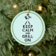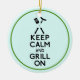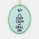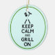 Round ceramic ornament with an image, on both sides, of the phrase “Keep Calm and Grill On” in bold black letters topped with barbecue utensils and a hot dog on aqua. Green border. See the entire Father’s Day Ornament collection in the SPECIAL TOUCHES | Party Favours section.