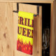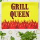Grill Queen funny bbq saying in a western flaming font for cooks and cookout chefs. With graphic art of red and orange flames on a yellow towel.