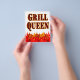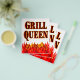 Grill Queen funny bbq saying in a western flaming font for cooks and cookout chefs. With graphic art of red and orange flames at the bottom of the design.