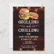 Grilling and Chilling Birthday Invitations. Easy to personalise. All text is adjustable and easy to change for your own party needs. String lights rustic background elements. Fun Chalkboard swirls and flourishes. Watercolor hamburger and hotdog graphics. Invitations for him. Bar or backyard BBQ birthday design. Any age, just change the text.