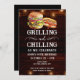 Grilling and Chilling Birthday Invitations. Easy to personalise. All text is adjustable and easy to change for your own party needs. String lights rustic background elements. Fun Chalkboard swirls and flourishes. Watercolor hamburger and hotdog graphics. Invitations for him. Bar or backyard BBQ birthday design. Any age, just change the text.