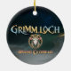 Celebrate the season with a touch of dark fantasy using this Grimmloch ceramic ornament, featuring the official emblem of the narrative-based RPG by Opulent Code LLC. The intricate horned goat crest, framed in rich teal and gold tones, creates a striking design that feels both mystical and elegant against holiday greenery.