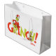 This vibrant and bold graphic is the perfect logo for the holiday mischief-maker! The word "GRINCH!" is displayed in large, stylized letters, primarily in festive red and lime green. The Grinch himself (in his Santa suit) stands right over the letters with his hands on his hips, looking mischievously proud. Beside him, his loyal partner, Max the Dog (complete with reindeer antlers), sits patiently. This fun graphic is a great way to celebrate the iconic characters and their story!