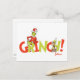 This vibrant and bold graphic is the perfect logo for the holiday mischief-maker! The word "GRINCH!" is displayed in large, stylized letters, primarily in festive red and lime green. The Grinch himself (in his Santa suit) stands right over the letters with his hands on his hips, looking mischievously proud. Beside him, his loyal partner, Max the Dog (complete with reindeer antlers), sits patiently. This fun graphic is a great way to celebrate the iconic characters and their story!