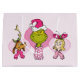 This delightful illustration brings together the full Grinch crew—the Grinch, Max the Dog, and Cindy Lou Who—in a sweet, non-traditional style! The Grinch is front and center with a mischievous smile, sporting a pink Santa hat and polka dot scarf. He's flanked by Max (in antlers) and Cindy Lou Who (in her red bow), both wearing matching pink scarves. The pink heart shapes behind each character emphasize a whimsical, loving, and totally unique holiday (or even Valentine's Day) spirit!