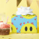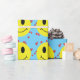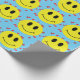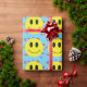Classic grinning faces with red hearts on blue highlight this fun gift wrap.