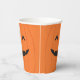 Halloween paper cups with the face of a grinning jack-o-lantern pumpkin. They have an orange and black colour scheme.