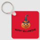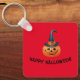 The front of the keychain shows a grinning pumpkin on a red background, together with the words "Happy Halloween!". The keychain can be easily personalised.