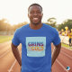 The eye-catching t-shirt design features the phrase "Grins for Gold" in a vibrant multicolor gradient. Each letter seamlessly transitions into the next, creating a dynamic and cheerful look.