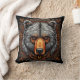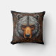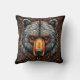 Highly stylised illustration of a bear's head, depicted with intricate details and vibrant colours. The bear's fur is primarily grey with hints of orange around its snout, giving it a striking appearance. Its eyes are intense and captivating, contributing to the powerful expression of the animal. The bear is encircled by an ornate decorative border, which adds an artistic flair and richness to the composition. The background is black, which enhances the overall drama and depth of the piece, making the bear stand out prominently. The combination of colours and intricate designs creates a visually compelling artwork that conveys strength and majesty.