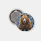Vibrant artwork depicting a bear with a rich, textured fur coat, set against a patchwork background featuring blue and grey tones. The bear stands imposing and lifelike, capturing attention with its realistic features.
