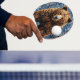 Vibrant artwork depicting a bear with a rich, textured fur coat, set against a patchwork background featuring blue and grey tones. The bear stands imposing and lifelike, capturing attention with its realistic features.