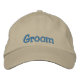 Make sure everyone knows you're the groom! Great cap has the word GROOM embroidered on the front of it in blue. Great for bachelor parties, wedding rehearsals and all those events that grooms have to attend! Give our "groomsman", "usher" and other wedding party caps as gifts to your entire wedding party!