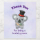A wine bottle label for groom appreciation or other situations. Text says" Thank You for being a koalaty groom. Customisable text. Designed with an illustration of a cute grey koala eating some eucalyptus leaves, wearing a fancy black top hat with a red ribbon. Set on a light purple digital watercolor background.