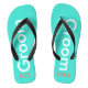 Groom is written in white text against bright turquoise blue with black accents. Personalise with date of wedding in coral. Cool beach destination or honeymoon flip flops. Original designs by TamiraZDesigns.