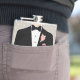 Smartly dressed groomsman in tuxedo and black bow tie graphic wedding hip flask. Reads Groomsman Oliver. Personalise with your own name and title. A great personalised gift idea for male bonding on bucks nights / stag nights, wedding rehearsals or as a wedding favour.