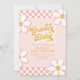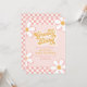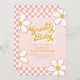 Groovy Baby Retro inspired Baby Shower invitation with 70's style fonts and daisies and chequered pattern.